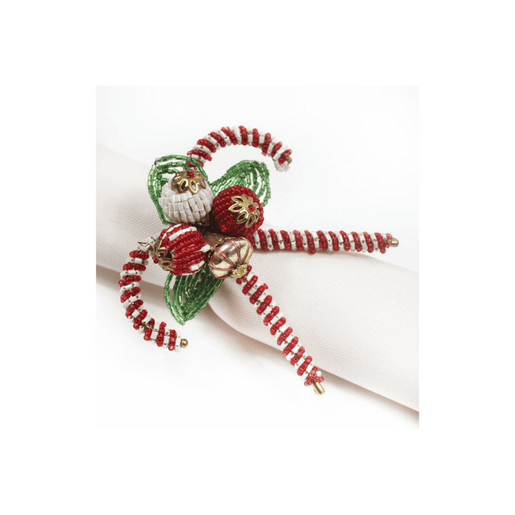 Bring a touch of festive fun to your table with the Christmas 'Candy Canes' Napkin Ring. Handcrafted with striking red and white beads on a durable metal frame, this playful accessory adds a whimsical yet stylish touch to your dining décor.
