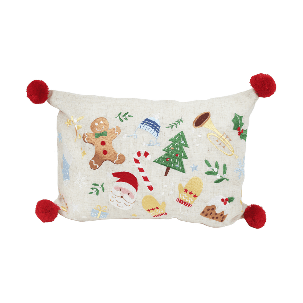 Bring warmth and festive charm to your home with the Christmas Cushion 'Santa's Grotto'. Beautifully embroidered with classic Christmas icons including Santa, a Christmas tree, and a gingerbread man, this cushion adds a cosy and joyful touch to any living space.
