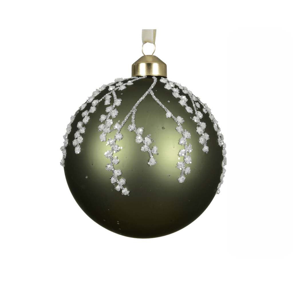 Add timeless style and sparkle to your festive décor with the Christmas Glass Bauble Branches/Dots. Measuring 10cm, each bauble features a smooth matt finish adorned with an elegant glitter branches and dots design, complete with a soft cream velvet hanger for a refined touch.