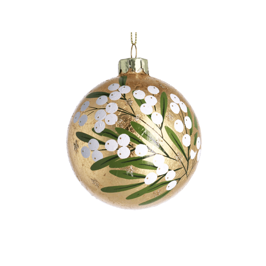 Beautiful glass bauble featuring a gold leaf and mistletoe design