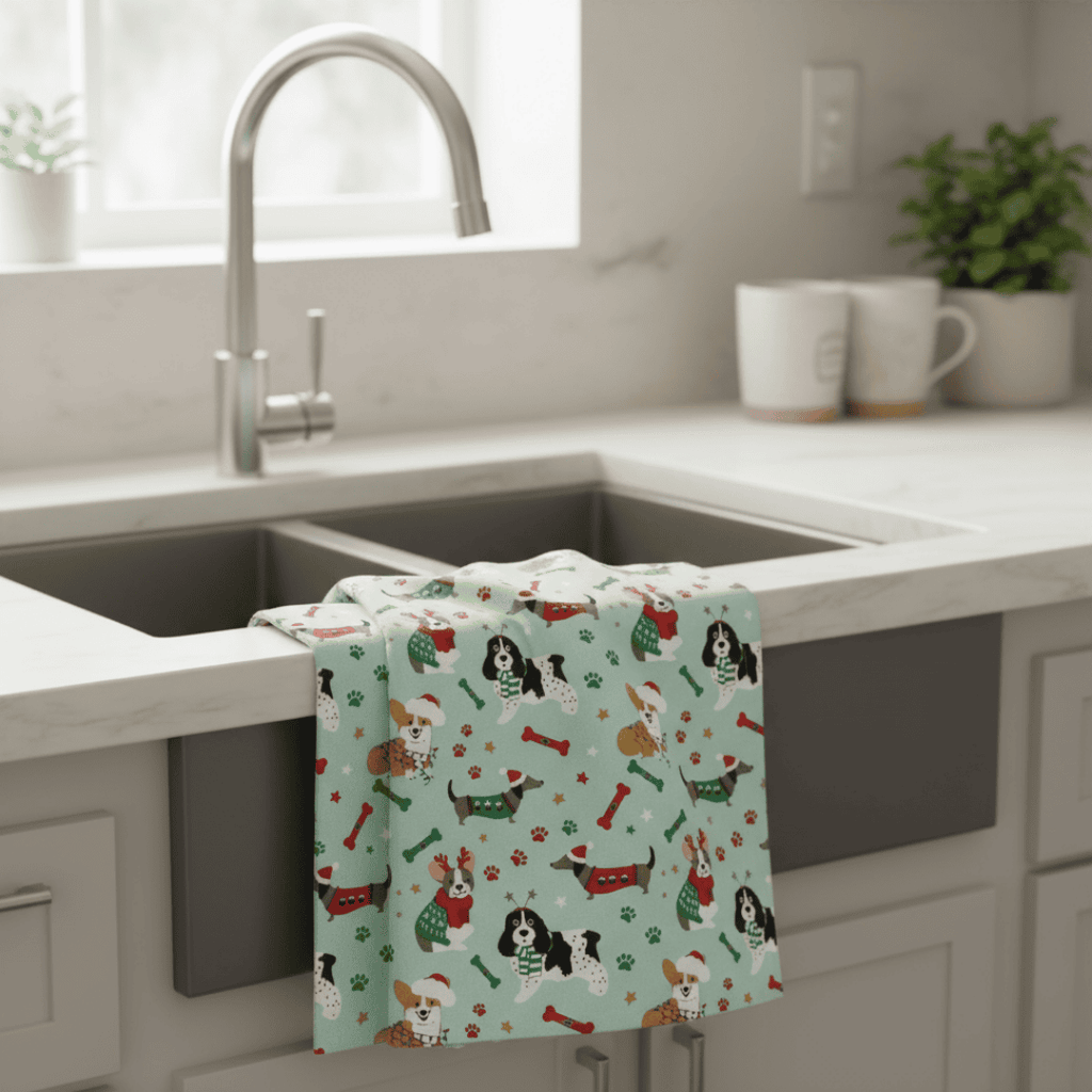Featuring an adorable design of festive dogs in Santa hats and holiday outfits, it’s a delightful addition to your seasonal décor and a thoughtful gift for any dog lover.