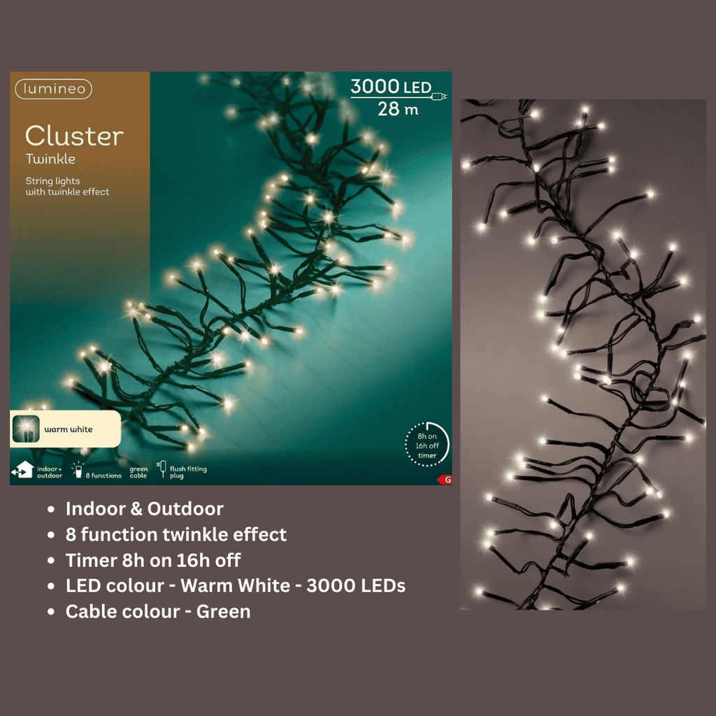 Bring brilliance and warmth to your Christmas celebrations with these premium 3000 LED cluster lights – designed for unforgettable festive displays indoors or out.