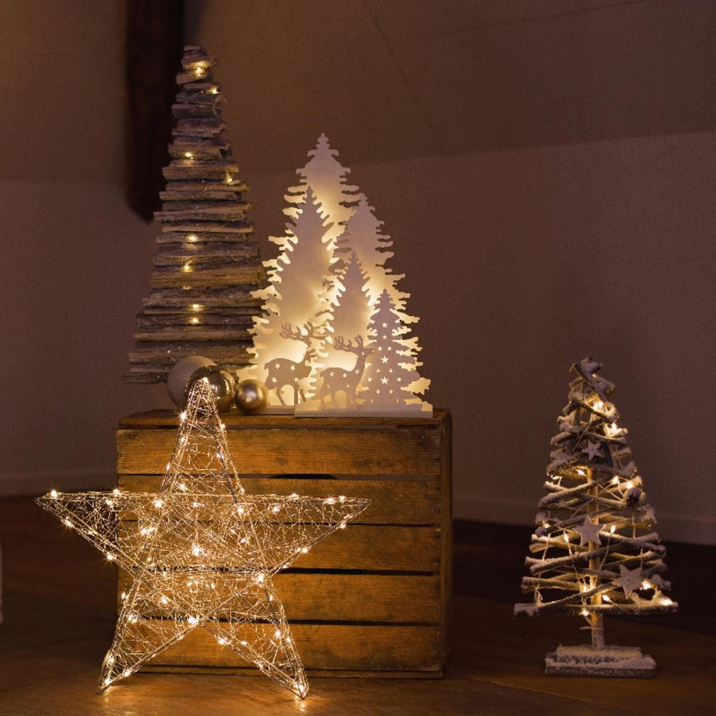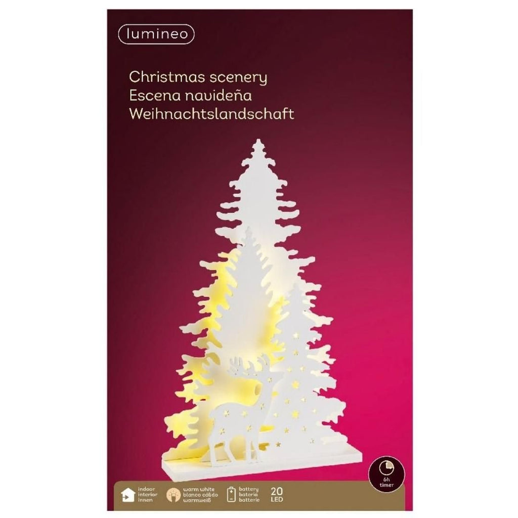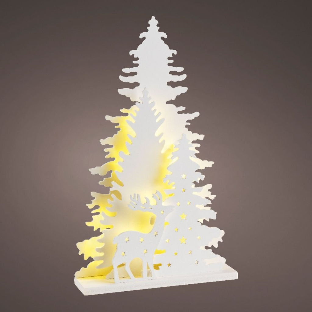 Festive Winter Design: Trees and reindeer silhouette illuminated with warm white LED lights.