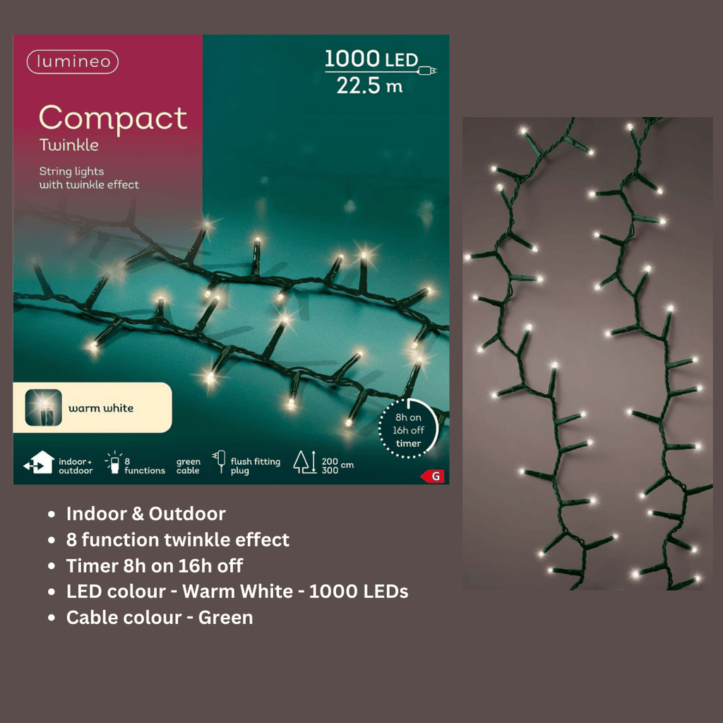 Create the perfect festive glow with 1000 compact LED Christmas lights in warm white. Designed to bring charm and warmth to your seasonal décor, these premium-quality lights are ideal for a 6ft Christmas tree or adding a cosy sparkle to windows, gardens, fences, or mantelpieces.