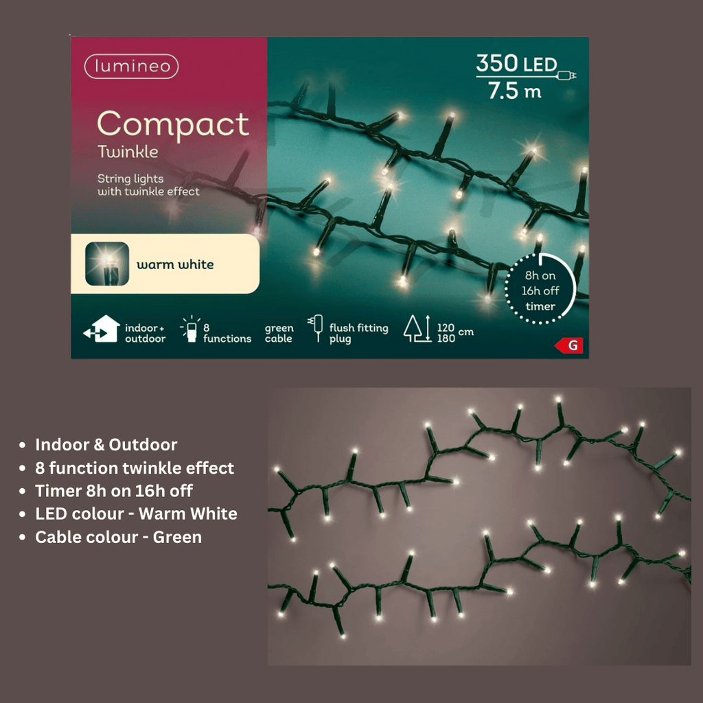 Add a warm festive sparkle to your home with these 350 compact LED Christmas lights in soft warm white. Perfect for smaller trees, window frames, mantelpieces, staircases, or outdoor railings, this high-quality light set offers a beautiful glow and reliable performance for the festive season.