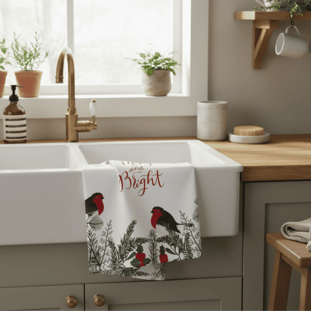 Bring warmth and seasonal joy to your home with the Christmas 'Merry & Bright' Tea Towel. Featuring charming robin illustrations nestled among winter foliage and berries, this tea towel adds a beautiful festive touch to your kitchen during the holiday season.