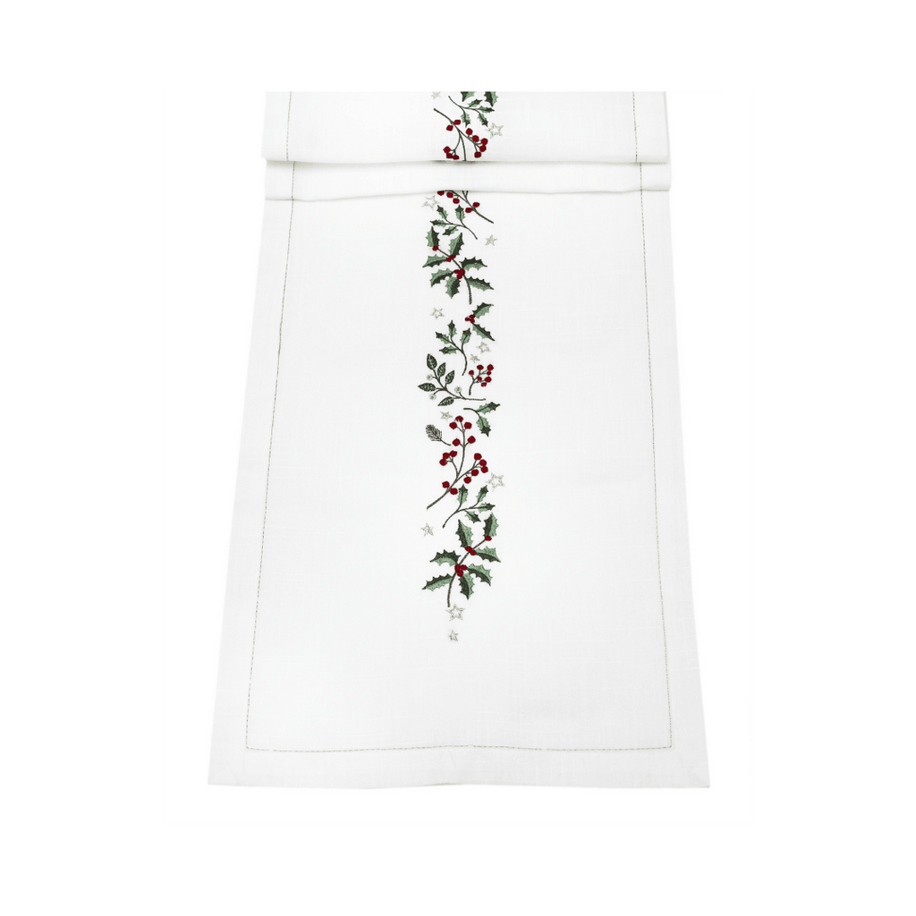 Bring seasonal charm to your dining table with the Christmas Table Runner 'Berry Fall'. Featuring a crisp white base adorned with elegant green foliage and rich red berries, this runner captures the warmth and beauty of the festive season.