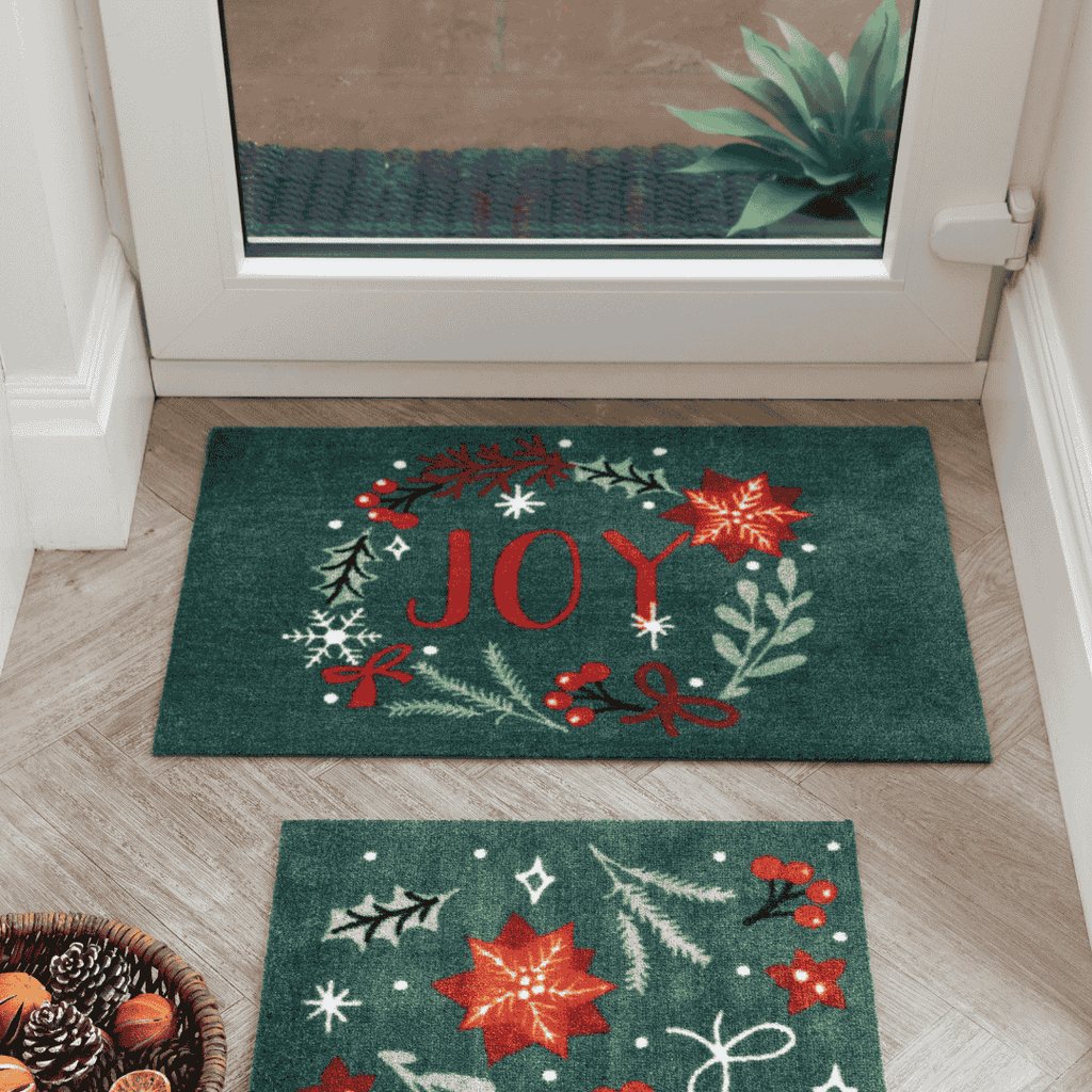 Bring a warm and welcoming touch to your home this season with the Door Mat Festive Joy. Designed with a deep green background, a wreath of festive foliage, and the word Joy in bold red, this mat captures the spirit of the season. The coordinating runner option features a repeating pattern of foliage, bows, and snowflakes, making it a perfect choice for creating a cheerful, inviting hallway.