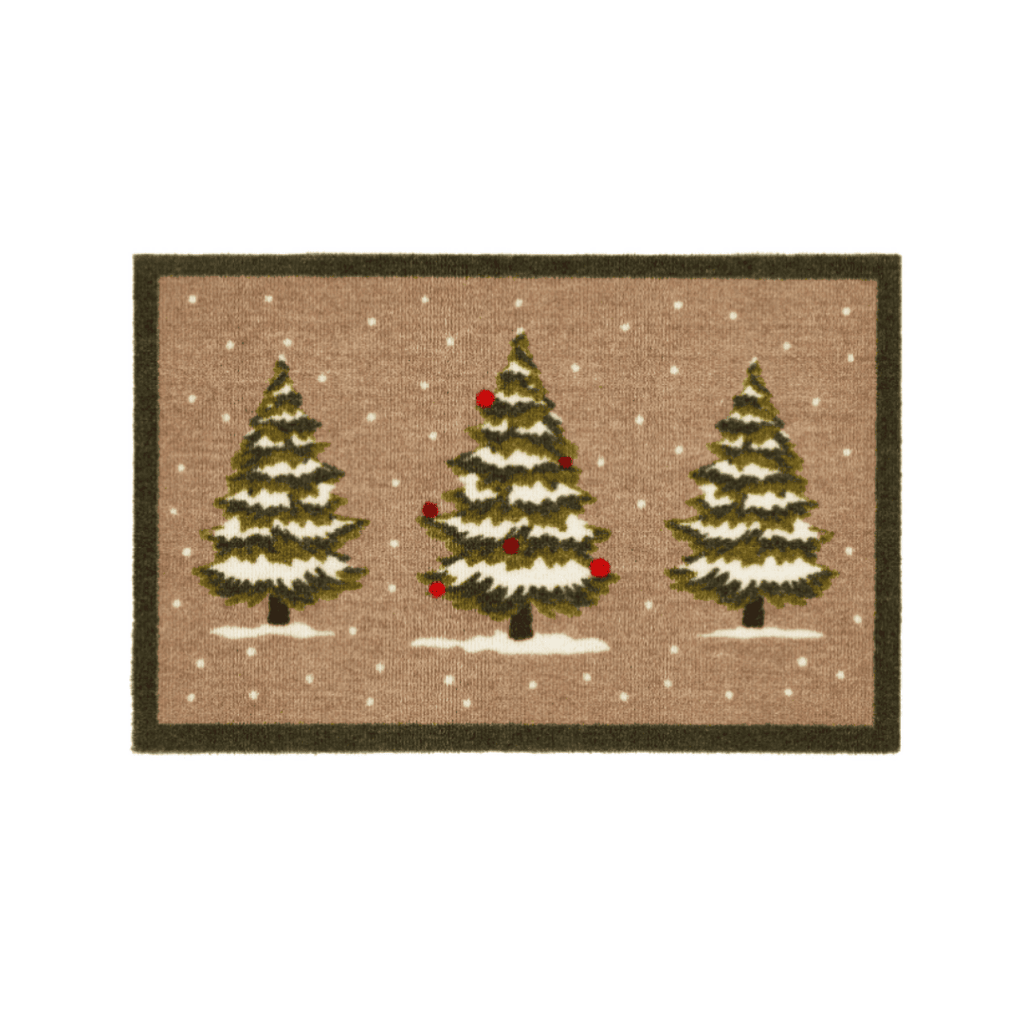 Welcome the season in style with the Door Mat Winter Trees, designed to keep your floors clean while adding a festive touch to your entrance. Featuring three snowy green Christmas trees on a beige background with a dark green border, the central tree decorated with red baubles brings a cheerful focal point.