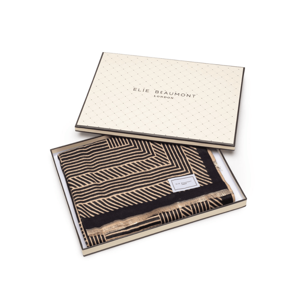 Wrap yourself in comfort and contemporary style with the Elie Beaumont Winter Scarf – Black & Sand Geometric. Luxuriously soft to the touch, this reversible scarf offers two distinct looks, giving you the versatility to match your outfit and mood throughout the season.