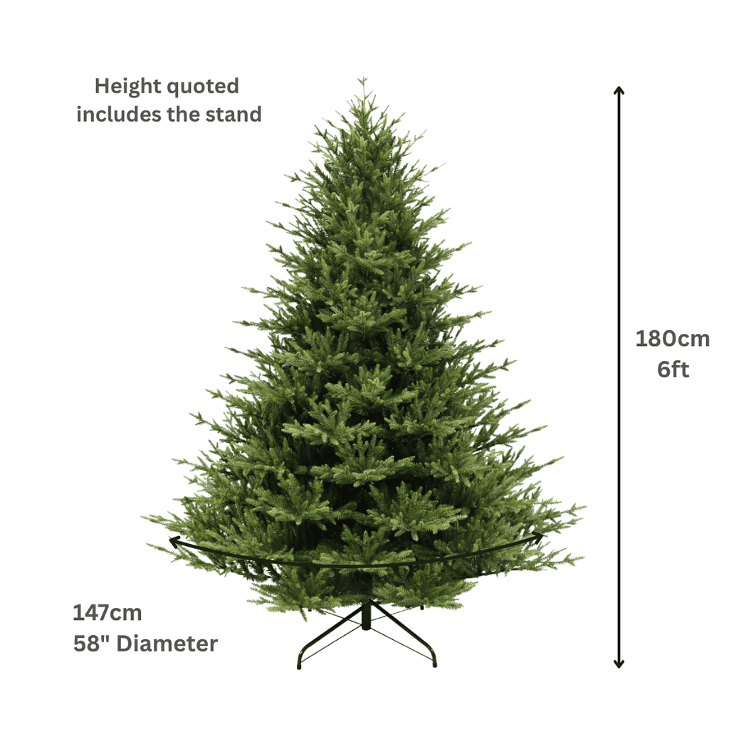 Standing at 180cm tall (including stand), the tree has a generous 120cm base diameter, making it ideal for decorating with baubles, lights, and garlands. Its lifelike appearance is matched with a highly practical design: the hinged branches and sturdy metal stand make assembly and storage quick and simple.