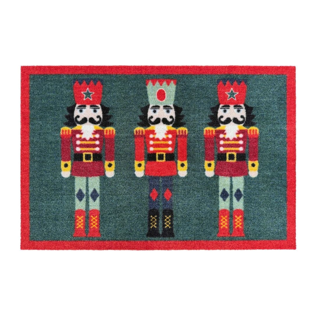 This charming Christmas doormat features three traditional nutcracker figures displayed against a dark backdrop and framed by a striking red border. Practical and hard-wearing, it combines seasonal style with year-round reliability.