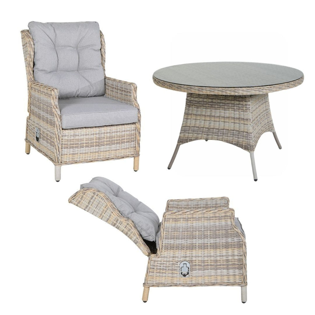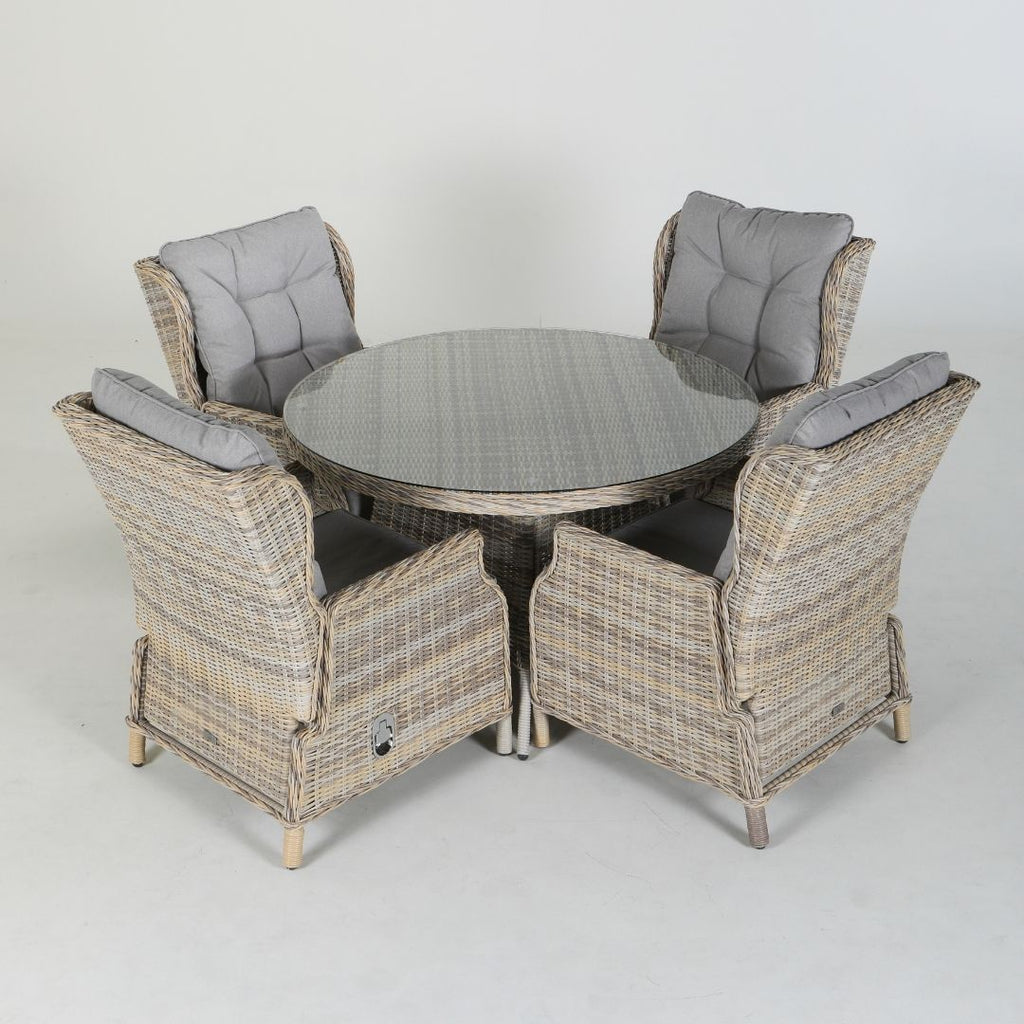 This luxurious rattan garden dining set includes a generously sized round dining table and four reclining armchairs. The high-back chairs feature deep seating to provide outstanding comfort and support, allowing you and your guests to relax long after the meal has finished.