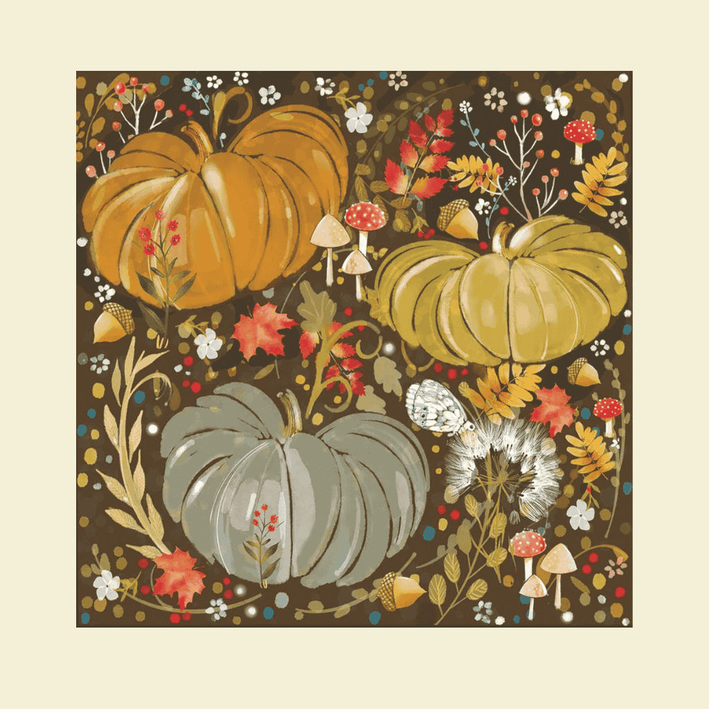Add a seasonal touch to your table setting with these Pumpkin Aurelia Paper Napkins. Featuring a beautiful autumn-inspired design of pumpkins, toadstools, and foliage set against a dark background, they bring warmth and charm to any occasion.