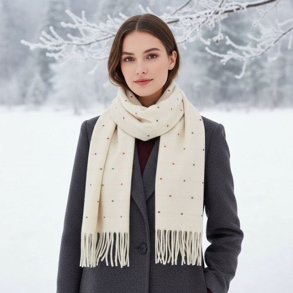 Add a touch of playful sophistication to your wardrobe with the Scarf Dots – Cream from Zelly. Featuring a subtle self-coloured background decorated with delicate multicoloured spots, this supersoft scarf brings charm and style to any outfit.