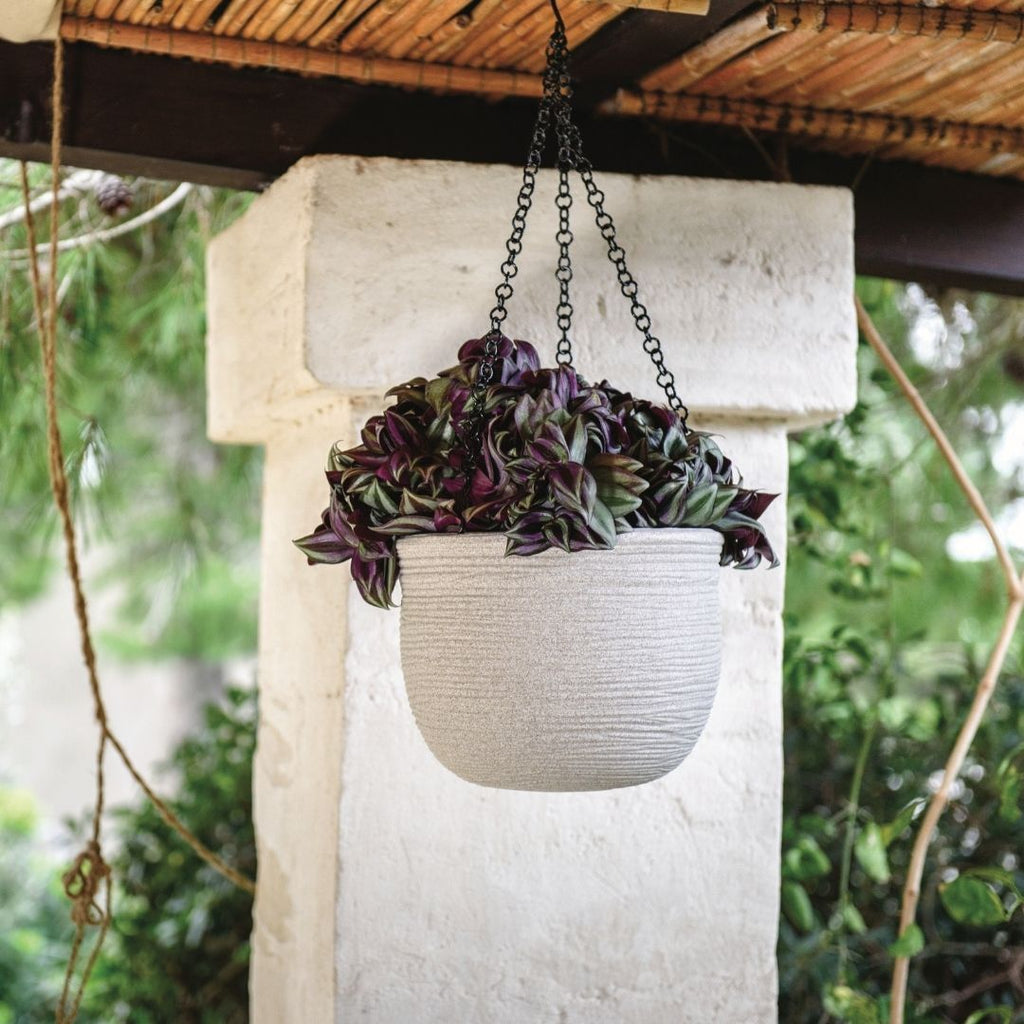 The Shabby Hanging Pot Corda is a lightweight hanging plant pot designed for both indoor and outdoor use. Made in Italy by Vasar, this durable plastic planter features a shabby, linear texture that adds character and depth to any space. It is ideal for showcasing trailing plants while keeping surfaces clear and uncluttered.