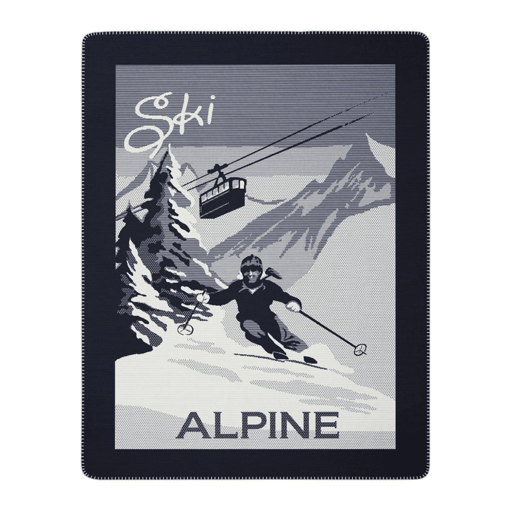 Featuring a detailed ski scene with snow-covered slopes, a skier, and a ski lift in soft blue and grey tones, this blanket adds a unique seasonal charm to any interior. The carefully hand-sewn edge embroidery provides a refined finish and a distinctive character.