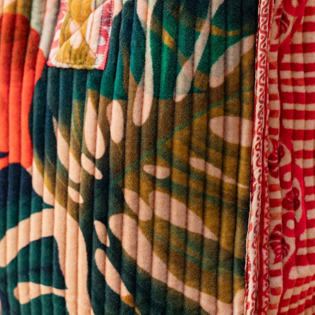 Featuring an intricate botanical leaf print inspired by rainforest foliage, this statement velvet tote bag adds distinctive style to any outfit. The quilted construction provides structure and durability, while the spacious interior ensures plenty of room for daily essentials.