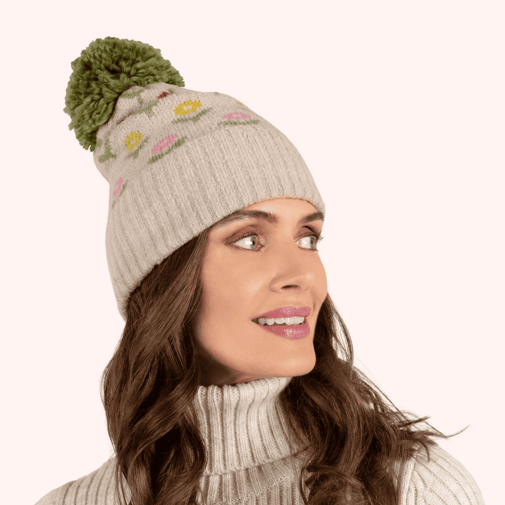 Playful and cosy, the Willow Ditsy Flower Pompom Hat in Cream is designed to brighten grey days with charm and comfort. Featuring a ditsy floral pattern and topped with a soft pompom, it blends warmth with a touch of fun, making it an essential accessory for the colder months.