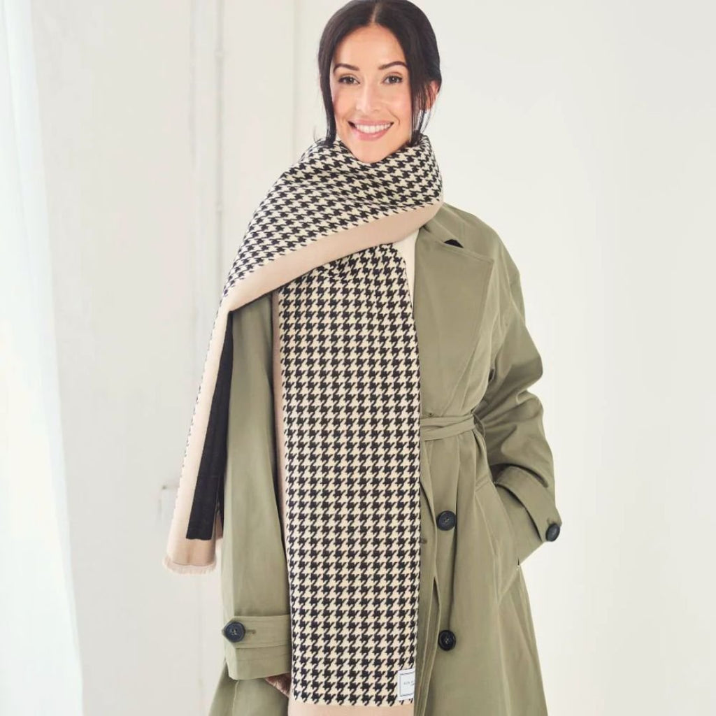 Designed with attention to detail, this premium ladies scarf can be worn as a shawl or wrap, adding comfort and elegance to any outfit. The classic black dogtooth check pattern provides a chic, contemporary finish that never goes out of style.