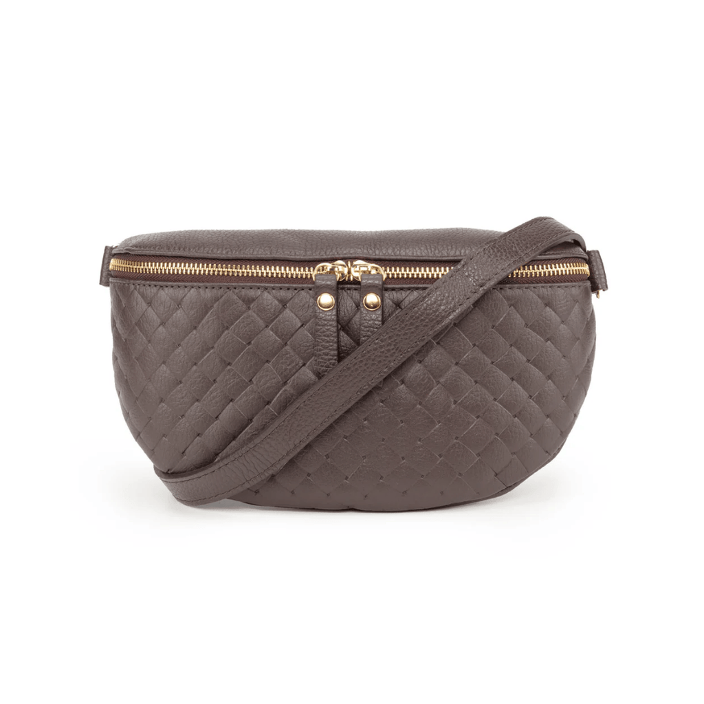 The woven leather front panel adds texture and character, while subtle gold metal fittings complement its refined aesthetic. Designed for modern lifestyles, it features a thoughtfully designed full-length zip pocket for secure storage, along with an interior pocket to keep your cards, phone, and essentials neatly organised.